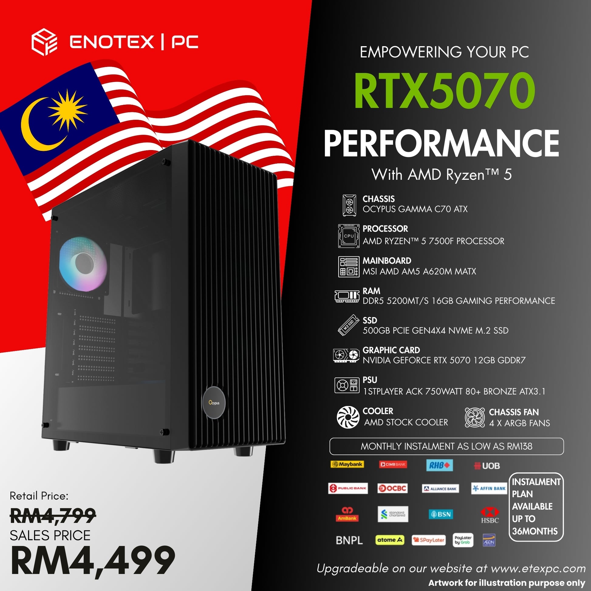 Processor: AMD Ryzen™ 5 7500F Processor 32MB Cache, Up To 4.4GHz # AM5 6 Core 12 ThreadsCooler: Ocypus Gamma A40 BKMainboard: AMD AM5 MSI A620M-E Pro mATXRam: 16GB 5200MT/s DDR5 Performance RamGraphic Card: NVIDIA GeForce RTX 5070 12GB GDDR7SSD: Acer FA200 500GB Gen4 NVMe M.2 SSDPSU: 1st Player ACK 750Watt 80+ Bronze ATX3.1 Power SupplyChassis: Ocypus GAMMA C70 ATX with 4x ARGB FansOS: Microsoft Windows 11 Pro Activated