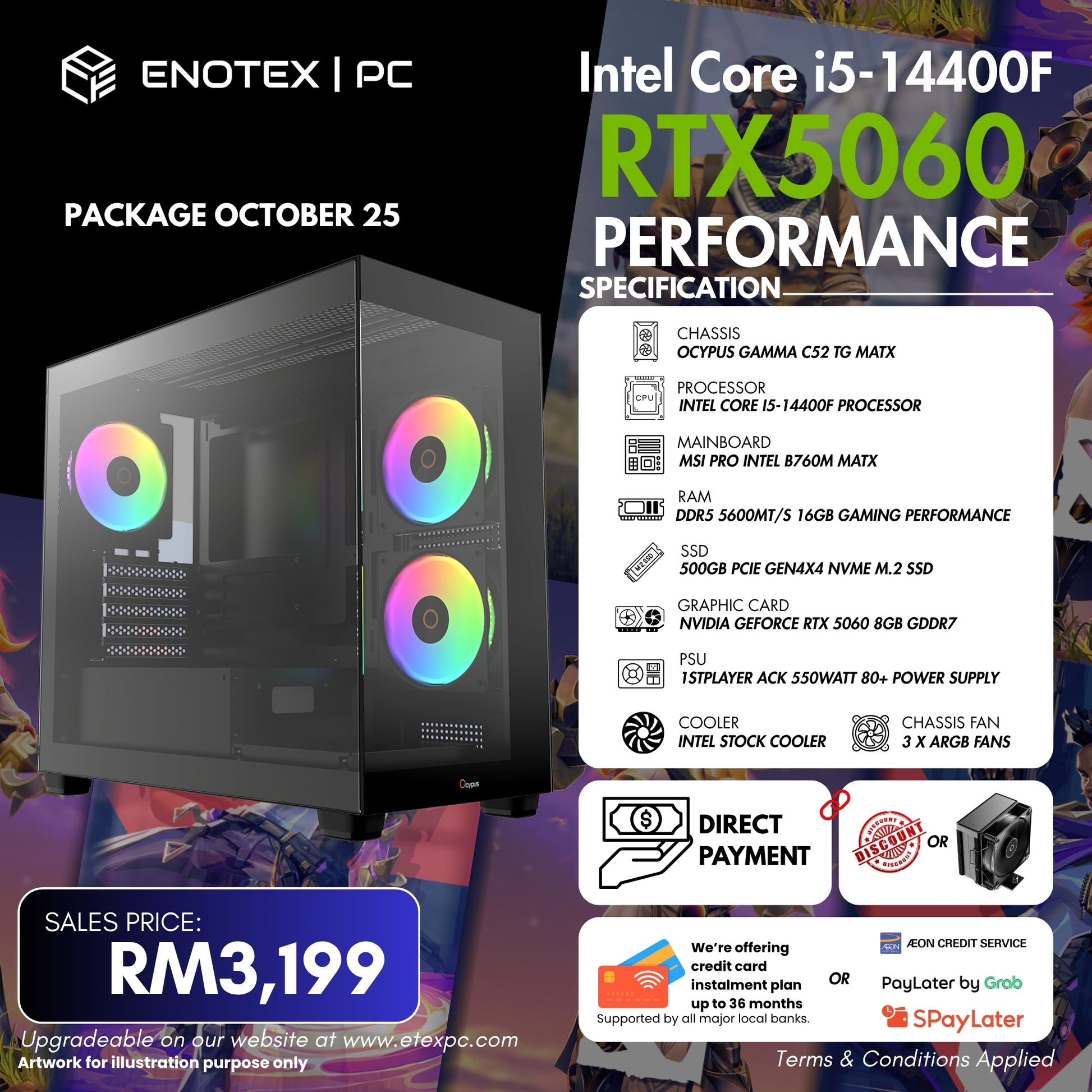 Processor: Intel CORE I5-14400F Processor 20M Cache, Up To 4.70 GHz # LGA1700 10 Core (6P+4E) 16 ThreadsCooler: Intel Stock CoolerMainboard: Intel LGA1700 MSI Pro B760M-E DDR5 mATXRam: XPG Lancer Blade DDR5 5600MT/s 16GB Gaming RamGraphic Card: PNY NVIDIA GeForce RTX 5060 8GB GDDR7SSD: Acer FA200 500GB Gen4 NVMe M.2 SSDPSU: 1st Player ACK 550Watt 80+ Power SupplyChassis: Ocypus Gamma C52 TG mATX with 3x ARGB Fans