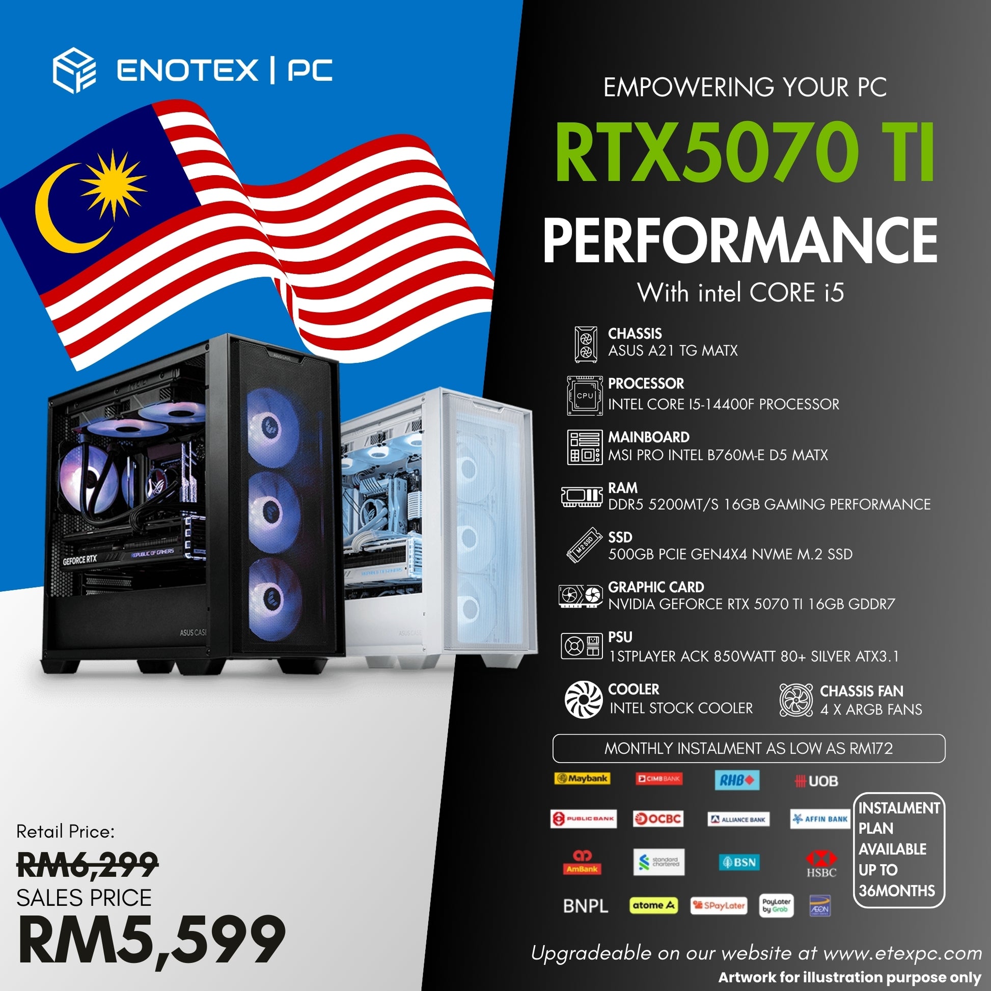 Processor: Intel CORE I5-14400F Processor 20M Cache, Up To 4.70 GHz # LGA1700 10 Core (6P+4E) 16 ThreadsCooler: Intel Stock CoolerMainboard: Intel LGA1700 MSI B760M-E DDR5 mATXRam: 16GB 5200MT/s DDR5 Performance RamGraphic Card: NVIDIA GeForce RTX 5070 Ti 16GB GDDR7SSD: Acer FA200 500GB Gen4 NVMe M.2 SSDPSU: 1st Player ACK 850Watt 80+ Silver ATX3.1 Power SupplyChassis: ASUS A21 TG mATX with 4 x ARGB FansOS: Microsoft Windows 11 Pro Activated