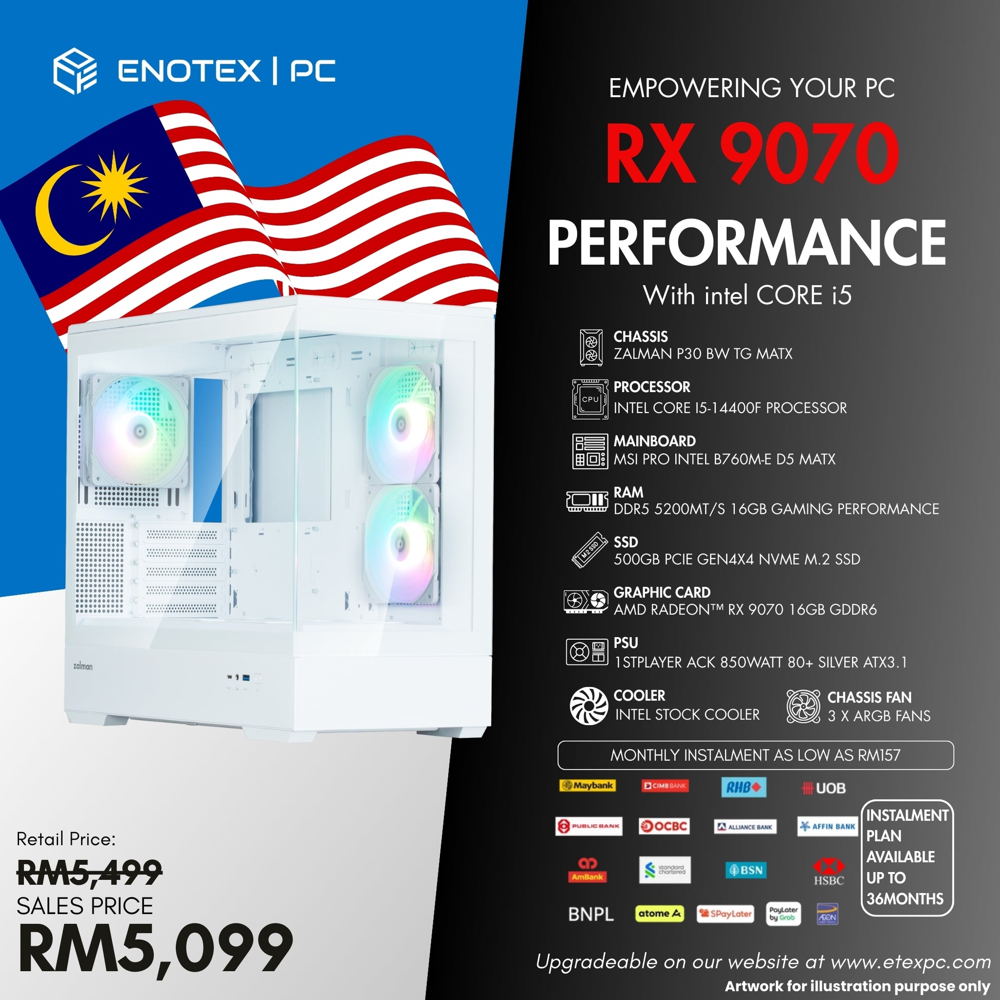 Processor: Intel CORE I5-14400F Processor 20M Cache, Up To 4.70 GHz # LGA1700 10 Core (6P+4E) 16 ThreadsCooler: Intel Stock CoolerMainboard: Intel LGA1700 MSI B760M-E DDR5 mATXRam: 16GB 5200MT/s DDR5 Performance RamGraphic Card: AMD Radeon™ RX 9070 16GB GDDR6SSD: Acer FA200 500GB Gen4 NVMe M.2 SSDPSU: 1st Player ACK 850Watt 80+ Silver ATX3.1 Power SupplyChassis: ZALMAN P30 BW TG mATX with 3 x ARGB FansOS: Microsoft Windows 11 Pro Activated