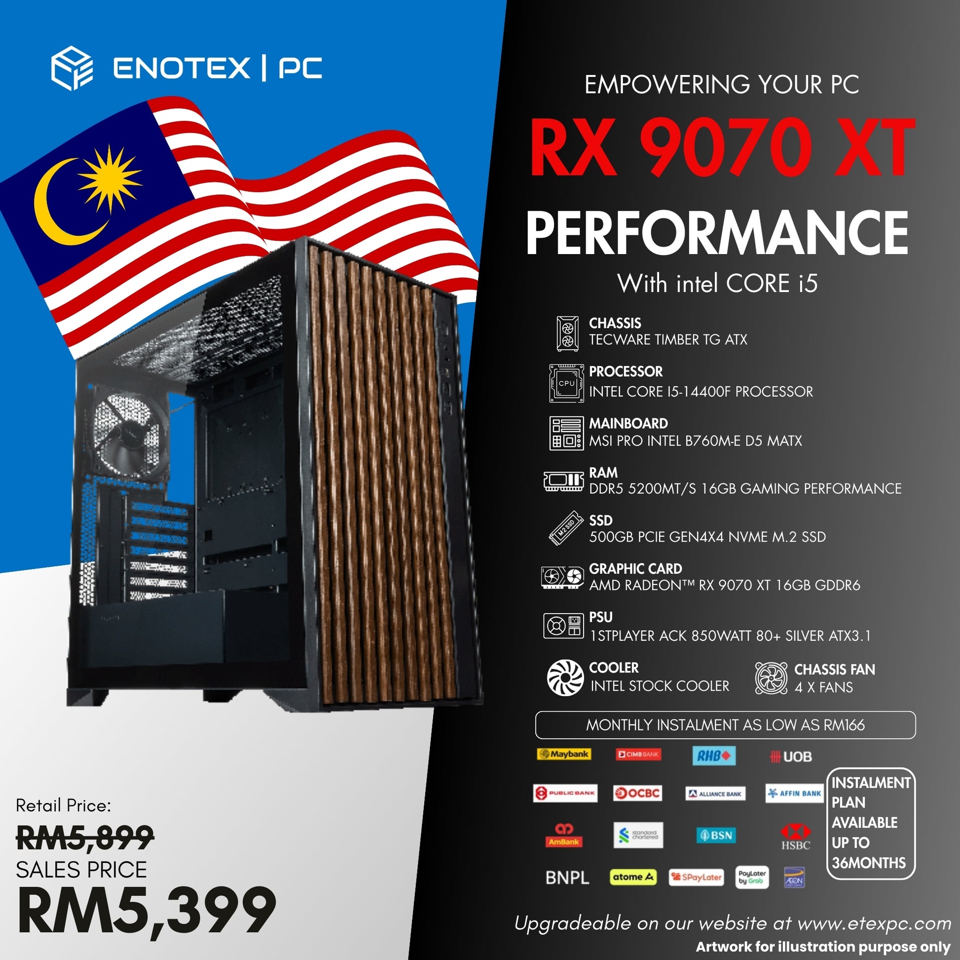 Processor: Intel CORE I5-14400F Processor 20M Cache, Up To 4.70 GHz # LGA1700 10 Core (6P+4E) 16 ThreadsCooler: Intel Stock CoolerMainboard: Intel LGA1700 MSI B760M-E DDR5 mATXRam: 16GB 5200MT/s DDR5 Performance RamGraphic Card: AMD Radeon™ RX 9070 XT 16GB GDDR6SSD: Acer FA200 500GB Gen4 NVMe M.2 SSDPSU: 1st Player ACK 850Watt 80+ Silver ATX3.1 Power SupplyChassis: Tecware Timber TG ATX Case - BlackOS: Microsoft Windows 11 Pro Activated